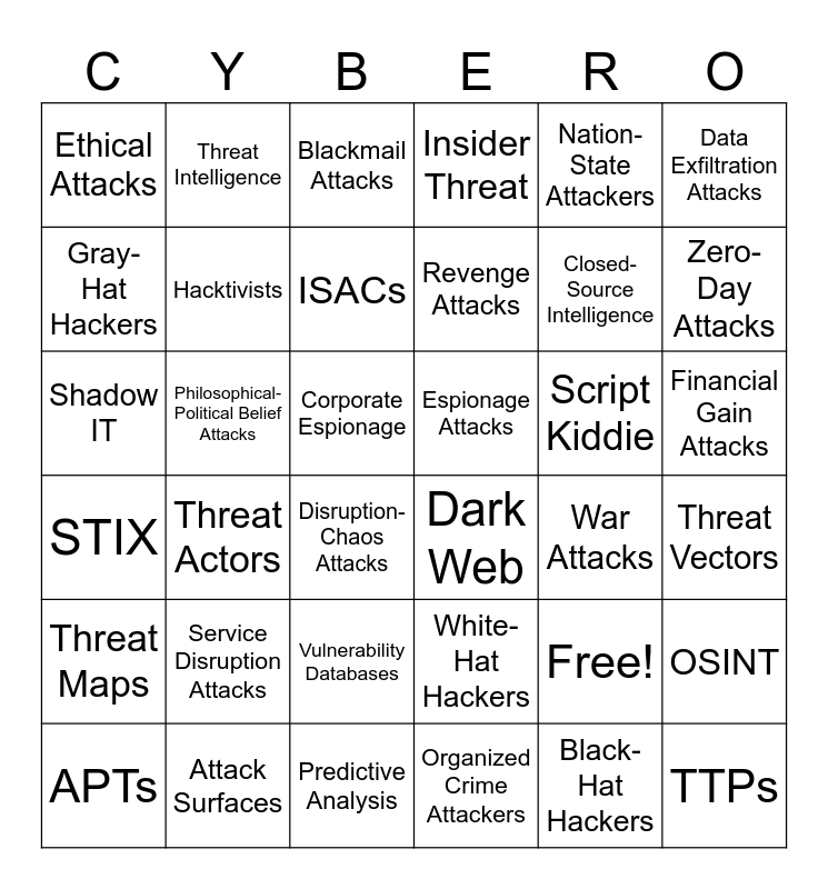 This bingo card has 37 words: Free!, White-Hat Hackers, Black-Hat Hackers, Gray-Hat Hackers, Threat Actors, Script Kiddie, Hacktivists, Organized Crime Attackers, Nation-State Attackers, APTs, Zero-Day Attacks, Insider Threat, Shadow IT, Corporate Espionage, Data Exfiltration Attacks, Espionage Attacks, Service Disruption Attacks, Blackmail Attacks, Financial Gain Attacks, Philosophical-Political Belief Attacks, Ethical Attacks, Revenge Attacks, Disruption-Chaos Attacks, War Attacks, Attack Surfaces, Threat Vectors, Threat Intelligence, Predictive Analysis, OSINT, Vulnerability Databases, IoCs, Dark Web, Closed-Source Intelligence, Threat Maps, STIX, ISACs and TTPs.