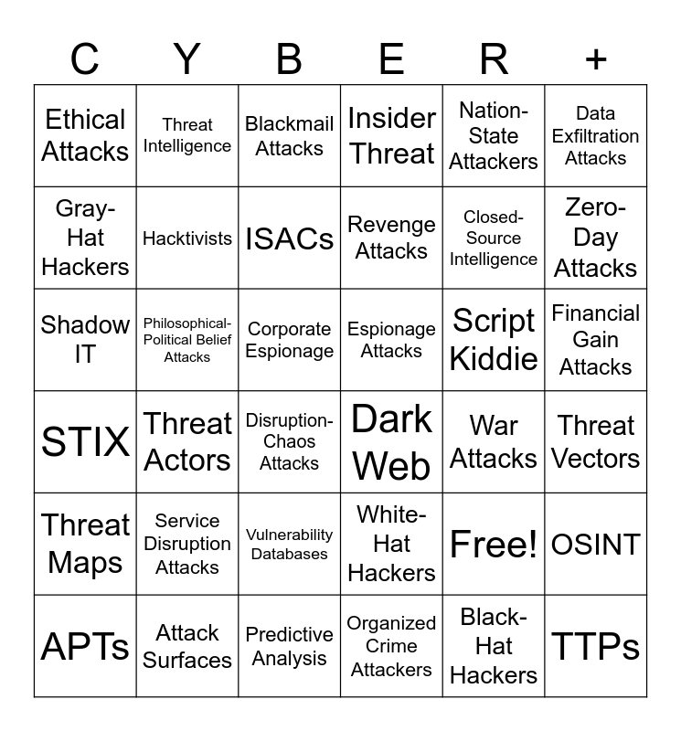 This bingo card has 37 words: Free!, White-Hat Hackers, Black-Hat Hackers, Gray-Hat Hackers, Threat Actors, Script Kiddie, Hacktivists, Organized Crime Attackers, Nation-State Attackers, APTs, Zero-Day Attacks, Insider Threat, Shadow IT, Corporate Espionage, Data Exfiltration Attacks, Espionage Attacks, Service Disruption Attacks, Blackmail Attacks, Financial Gain Attacks, Philosophical-Political Belief Attacks, Ethical Attacks, Revenge Attacks, Disruption-Chaos Attacks, War Attacks, Attack Surfaces, Threat Vectors, Threat Intelligence, Predictive Analysis, OSINT, Vulnerability Databases, IoCs, Dark Web, Closed-Source Intelligence, Threat Maps, STIX, ISACs and TTPs.