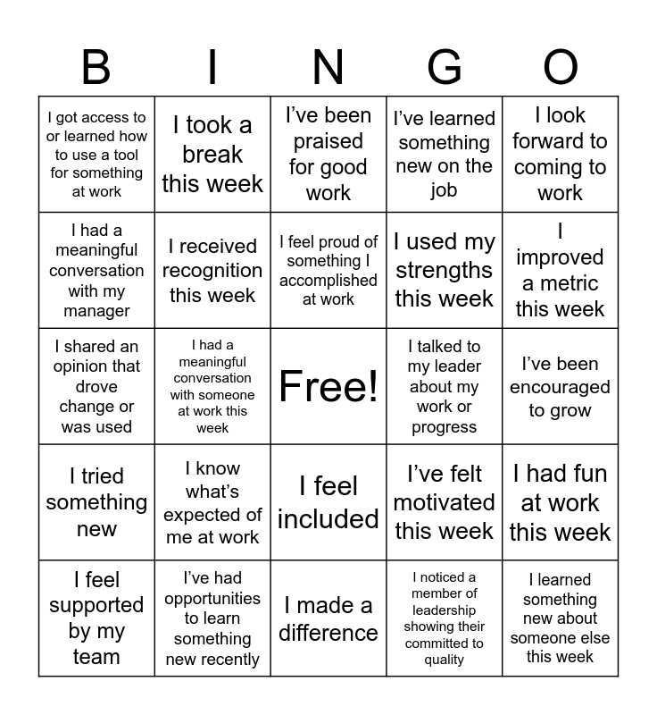 This bingo card has a free space and 24 words: I know what’s expected of me at work, I’ve had opportunities to learn something new recently, I feel proud of something I accomplished at work, I feel supported by my team, I look forward to coming to work, I got access to or learned how to use a tool for something at work, I had a meaningful conversation with my manager, I took a break this week, I talked to my leader about my work or progress, I feel included, I used my strengths this week, I shared an opinion that drove change or was used, I’ve felt motivated this week, I had fun at work this week, I received recognition this week, I noticed a member of leadership showing their committed to quality, I’ve been encouraged to grow, I’ve been praised for good work, I improved a metric this week, I had a meaningful conversation with someone at work this week, I learned something new about someone else this week, I tried something new, I’ve learned something new on the job and I made a difference.