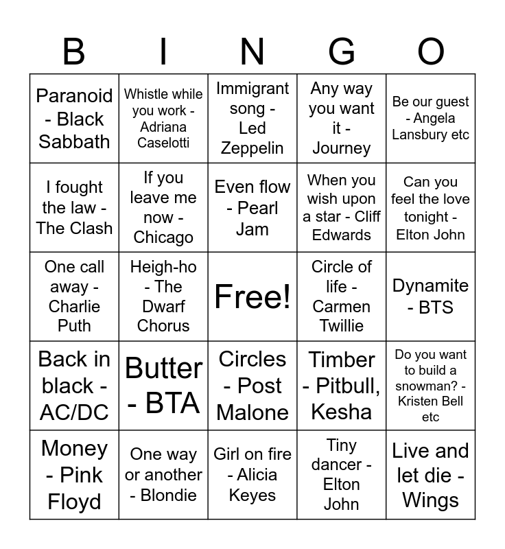 This bingo card has a free space and 59 words: Don't stop me now - Queen, One way or another - Blondie, Let it go - Idina Menzel, Back in black - AC/DC, Tiny dancer - Elton John, Hakuna Matata - Nathan Lane etc, If you leave me now - Chicago, Mississippi Queen - Mountain, When you wish upon a star - Cliff Edwards, Cats in the cradle - Harry Chapin, Any way you want it - Journey, You've got a friend in me -Randy Newman, I fought the law - The Clash, Fight for your right - Beastie Boys, Beauty and the Beast - Angela Lansbury, Paranoid - Black Sabbath, Live and let die - Wings, Be our guest - Angela Lansbury etc, Girls on film - Duran Duran, Even flow - Pearl Jam, Circle of life - Carmen Twillie, Immigrant song - Led Zeppelin, Money - Pink Floyd, Do you want to build a snowman? - Kristen Bell etc, No sleep till Brooklyn - Beastie Boys, Under the sea - Samuel E. Wright, Crazy on you - Heart, Been caught stealing - Jane's Addiction, Can you feel the love tonight - Elton John, Spoonman - Soundgarden, Blurry - Puddle of Mudd, A spoonful of sugar - Julie Andrews, Are you gonna be my girl - Jet, Dani California - Red Hot Chili Peppers, Whistle while you work - Adriana Caselotti, Cult of Personality - Living Colour, Shivers - Ed Sheeran, Heigh-ho - The Dwarf Chorus, I don't care - Ed Sheeran, Justin Bieber, One call away - Charlie Puth, Single ladies - Beyonce, Butter - BTA, Dynamite - BTS, Can't stop the feeling - Justin Timberlake, My universe - Coldplay, BTS, Levitating - Dua Lipa, All that bass - Meghan Trainor, Despacito - Luis Fonsi, Daddy Yankee, Justin Bieber, Circles - Post Malone, Girl on fire - Alicia Keyes, Rain on me - Lady Gaga, Ariana Grande, Somebody that I used to know - Gotye, Kimbra, Wake me up - Avicii, 7 years - Lukas Graham, Sunroof - Nicky Youre, hey daisy, Timber - Pitbull, Kesha, Hea waves - Glass Animals, Unstoppable - Sia and Drive by - Train.