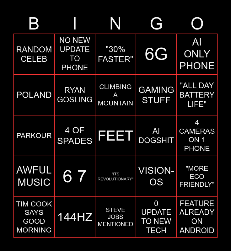 This bingo card has a free space and 24 words: 6 7, 144HZ, CLIMBING A MOUNTAIN, TIM COOK SAYS GOOD MORNING, AI ONLY PHONE, RANDOM CELEB, POLAND, NO NEW UPDATE TO PHONE, AI DOGSHIT, "ITS REVOLUTIONARY", GAMING STUFF, PARKOUR, VISION-OS, "MORE ECO FRIENDLY", RYAN GOSLING, 0 UPDATE TO NEW TECH, 4 CAMERAS ON 1 PHONE, "30% FASTER", "ALL DAY BATTERY LIFE", 4 OF SPADES, FEATURE ALREADY ON ANDROID, AWFUL MUSIC, 6G and STEVE JOBS MENTIONED.