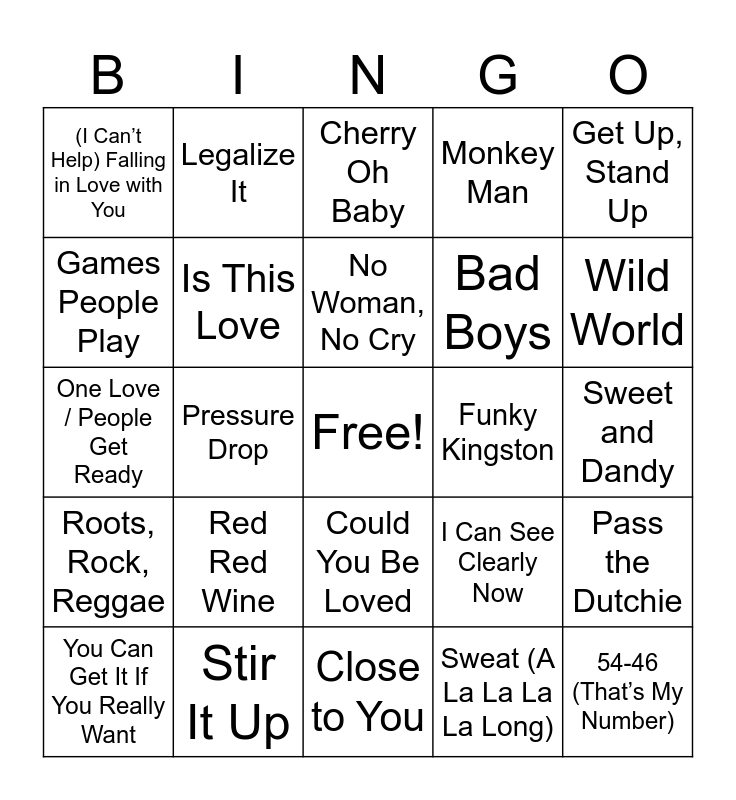 This bingo card has a free space and 40 words: Three Little Birds, One Love / People Get Ready, Buffalo Soldier, Is This Love, Stir It Up, Could You Be Loved, No Woman, No Cry, Jamming, Get Up, Stand Up, Roots, Rock, Reggae, Pressure Drop, Monkey Man, 54-46 (That’s My Number), Sweet and Dandy, Funky Kingston, Red Red Wine, Kingston Town, (I Can’t Help) Falling in Love with You, Here I Am (Come and Take Me), Cherry Oh Baby, Pass the Dutchie, Sweat (A La La La La Long), Bad Boys, Games People Play, Oh Carolina, In the Summertime, Angel, Boombastic, It Wasn’t Me, Reggae Night, Wonderful World, Beautiful People, You Can Get It If You Really Want, The Harder They Come, I Can See Clearly Now, Wild World, Close to You, Satta Massagana, Marcus Garvey, Legalize It and Wanted Dread and Alive.