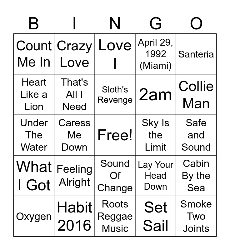 This bingo card has a free space and 39 words: Lay Me Down, Vacation, My Sweet Summer, That's All I Need, Oxygen, Sound Of Change, Sloth's Revenge, Dance All Night, Santeria, What I Got, Caress Me Down, April 29, 1992 (Miami), Smoke Two Joints, Safe and Sound, Sky Is the Limit, Feeling Alright, Bright Side of Life, Count Me In, Settle Down Easy, Lay Your Head Down, Heart Like a Lion, Roots Reggae Music, 2am, Collie Man, Top of the World, Closer to the Sun, Officer, Ashes, Give It Up, Crazy Love, Tradewinds, Nice Time, Love I, Habit 2016, Set Sail, Lazy Afternoon, Cabin By the Sea, Under The Water and The General.