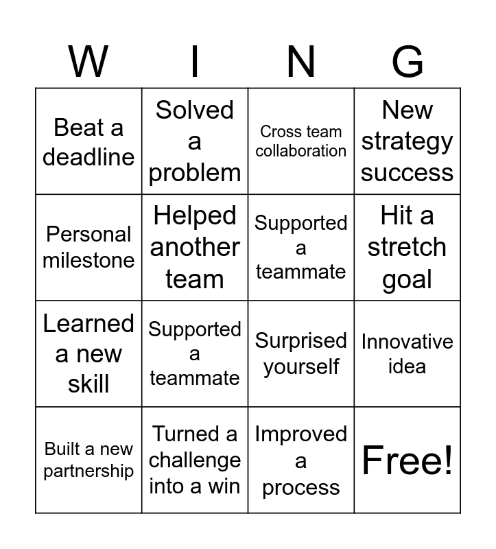 This bingo card has 18 words: Supported a teammate, Free!, Cross team collaboration, Beat a deadline, Surprised yourself, New strategy success, Built a new partnership, Solved a problem, Hit a stretch goal, Learned a new skill, Improved a process, Personal milestone, Innovative idea, Helped another team, Supported a teammate, Professional development, Turned a challenge into a win and Made it through FY25!.