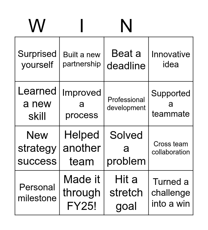 This bingo card has 16 words: Made it through FY25!, Cross team collaboration, Beat a deadline, Surprised yourself, New strategy success, Built a new partnership, Solved a problem, Hit a stretch goal, Learned a new skill, Improved a process, Personal milestone, Innovative idea, Helped another team, Supported a teammate, Professional development and Turned a challenge into a win.