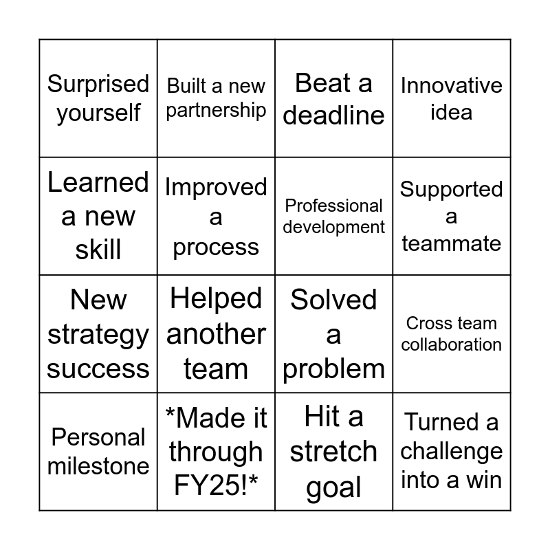This bingo card has 16 words: *Made it through FY25!*, Cross team collaboration, Beat a deadline, Surprised yourself, New strategy success, Built a new partnership, Solved a problem, Hit a stretch goal, Learned a new skill, Improved a process, Personal milestone, Innovative idea, Helped another team, Supported a teammate, Professional development and Turned a challenge into a win.
