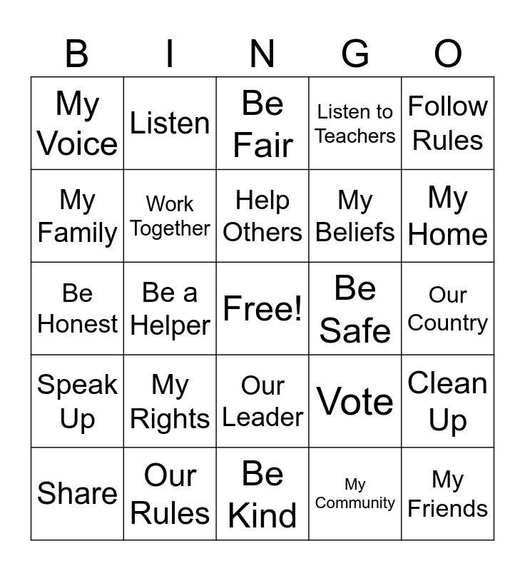 This bingo card has a free space and 25 words: My Rights, Be Kind, Help Others, Share, Follow Rules, My Voice, My Family, Listen, Be Safe, Our Leader, My Beliefs, Be Honest, Vote, Clean Up, Work Together, Give Back, Our Country, Be Fair, My Home, Be a Helper, My Friends, Our Rules, Speak Up, Listen to Teachers and My Community.