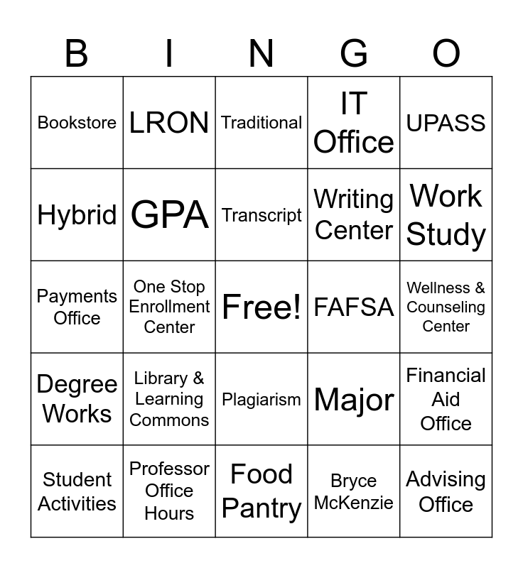 This bingo card has a free space and 27 words: Major, Career Services, Writing Center, Food Pantry, Hybrid, Traditional, LRON, Degree Works, FAFSA, Financial Aid Office, Payments Office, IT Office, Student Activities, Professor Office Hours, Work Study, Student Labor, GPA, Transcript, Library & Learning Commons, Bookstore, Wellness & Counseling Center, Bryce McKenzie, One Stop Enrollment Center, Advising Office, Plagiarism, UPASS and Student ID/Banner ID.