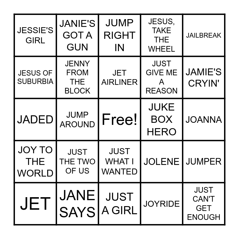 This bingo card has a free space and 43 words: JACK & DIANCE, JUST CAN'T GET ENOUGH, JUST DANCE, JET, JOSIE, JOYRIDE, JUMP RIGHT IN, JACKIE BLUE, JAILBREAK, JANE SAYS, JESUS, TAKE THE WHEEL, JUKE BOX HERO, JUST WHAT I WANTED, JUST THE TWO OF US, JUST THE WAY YOU ARE, JUST A GIRL, JACKSON, JADED, JAILHOUSE ROCK, JAMIE'S CRYIN', JANIE'S GOT A GUN, JEOPARDY, JEREMY, JESSIE'S GIRL, JIVE TALKIN', JOANNA, JOHNNY B. GOODE, JOHNNY CASH, JOLENE, JOY TO THE WORLD, JUMP, JUMPER, JUMPIN', JUMPIN', JUMP AROUND, JUMPIN' JACK FLASH, JUNGLE BOOGIE, JUNGLE LOVE, JET AIRLINER, JESUS OF SUBURBIA, JUST GIVE ME A REASON, JESSICA, JENNY FROM THE BLOCK and 867-5309/ JENNY.