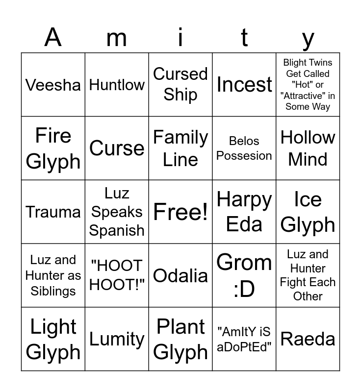 This bingo card has a free space and 24 words: "HOOT HOOT!", Lumity, Family Line, Light Glyph, Blight Twins Get Called "Hot" or "Attractive" in Some Way, Veesha, Fire Glyph, Huntlow, Harpy Eda, Odalia, Belos Possesion, Trauma, Grom :D, Luz and Hunter Fight Each Other, Curse, "AmItY iS aDoPtEd", Ice Glyph, Cursed Ship, Hollow Mind, Luz Speaks Spanish, Raeda, Luz and Hunter as Siblings, Incest and Plant Glyph.