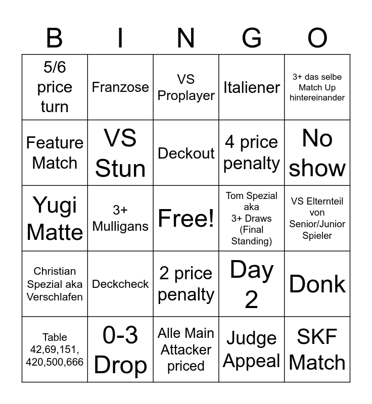 This bingo card has a free space and 24 words: Deckcheck, 0-3 Drop, Deckout, Table 42,69,151, 420,500,666, 3+ das selbe Match Up hintereinander, 5/6 price turn, Feature Match, Franzose, Tom Spezial aka 3+ Draws (Final Standing), 2 price penalty, 4 price penalty, Yugi Matte, Day 2, Donk, VS Stun, Judge Appeal, VS Elternteil von Senior/Junior Spieler, VS Proplayer, No show, 3+ Mulligans, SKF Match, Christian Spezial aka Verschlafen, Italiener and Alle Main Attacker priced.