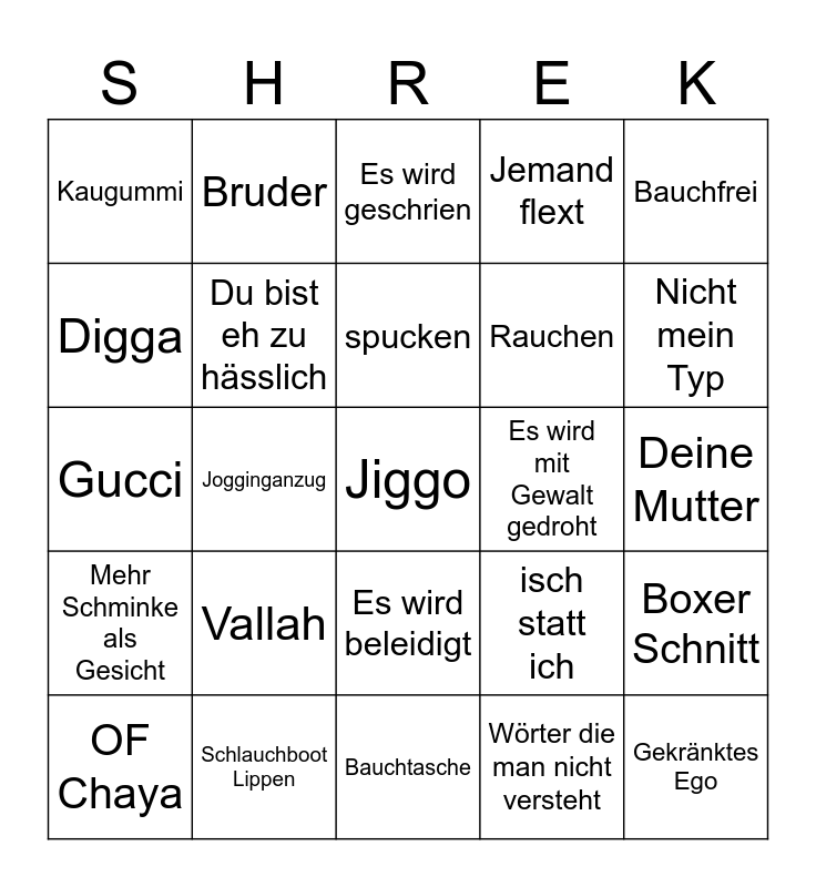 This bingo card has a free space and 24 words: Vallah, Schlauchboot Lippen, spucken, OF Chaya, Bauchfrei, Kaugummi, Digga, Bruder, Es wird mit Gewalt gedroht, Es wird beleidigt, Rauchen, Gucci, isch statt ich, Boxer Schnitt, Du bist eh zu hässlich, Wörter die man nicht versteht, Deine Mutter, Es wird geschrien, Nicht mein Typ, Jogginganzug, Gekränktes Ego, Mehr Schminke als Gesicht, Jemand flext and Bauchtasche.