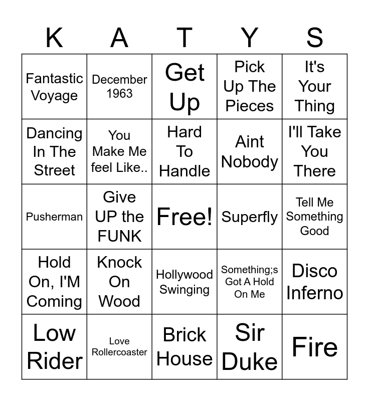 This bingo card has a free space and 34 words: Let's Groove, Sir Duke, September, Higher Ground, Hold On, I'M Coming, You Make Me feel Like.., It's Your Thing, Low Rider, December 1963, Right Place Wrong Time, Hard To Handle, Get Up, Express Yourself, It's Your Thing, Superfly, I'll Take You There, Love Rollercoaster, Pusherman, Knock On Wood, Something;s Got A Hold On Me, Hollywood Swinging, It's A Shame, Fantastic Voyage, Tell Me Something Good, Brick House, Fire, Pick Up The Pieces, Give It Away, Aint Nobody, Dancing In The Street, Don't Stop Till You..., Give UP the FUNK, Disco Inferno and Shake Shake.