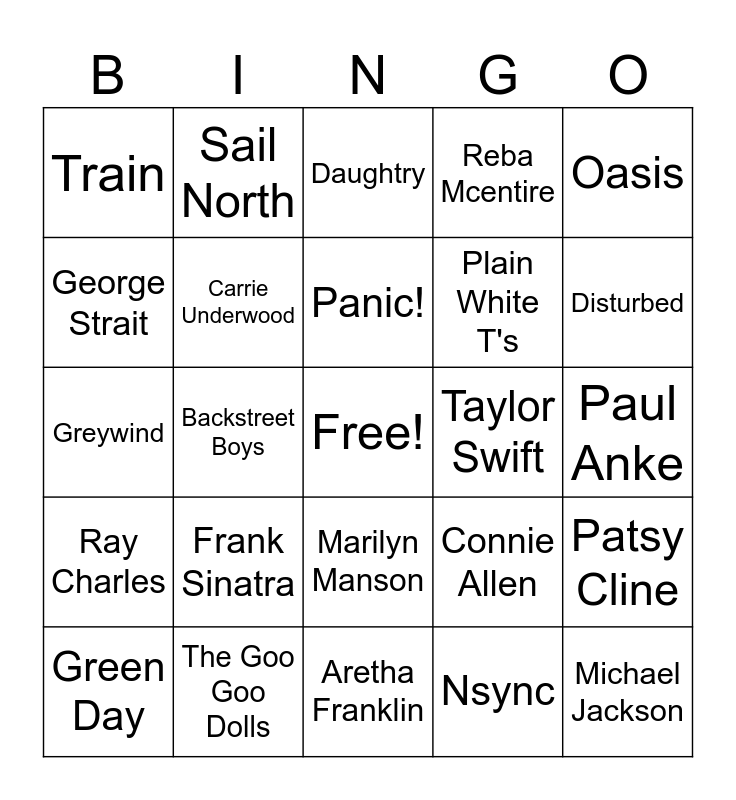 This bingo card has a free space and 51 words: Elvis Presley, Michael Jackson, Beyonce, Aretha Franklin, Frank Sinatra, Stevie Wonder, Sail North, Beatles, George Strait, Tim McGraw, Carrie Underwood, Reba Mcentire, Patsy Cline, Connie Allen, Johnny Cash, Beach Boys, Panic!, Taylor Swift, Bon Jovi, Oasis, Backstreet Boys, Nsync, Train, Plain White T's, Billy Joel, RadioHead, Disturbed, Owl City, Green Day, Daughtry, My Chemical Romance, Bad Omens, Linkin Park, Evanescence, Nickelback, The Goo Goo Dolls, The Cheetah Girls, Queen, Rascal Flatts, Skillet, Paul Anke, Ray Charles, Michael Buble, George Michael, Bruno Mars, AJR, Greywind, Sixpence None the Richer, Guns N Roses, Marilyn Manson and Sleep Token.