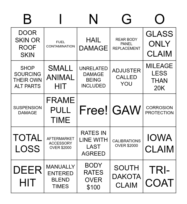 This bingo card has a free space and 24 words: AFTERMARKET ACCESSORY OVER $2000, MANUALLY ENTERED BLEND TIMES, UNRELATED DAMAGE BEING INCLUDED, DEER HIT, GLASS ONLY CLAIM, DOOR SKIN OR ROOF SKIN, SHOP SOURCING THEIR OWN ALT PARTS, FUEL CONTAMINATION, GAW, RATES IN LINE WITH LAST AGREED, ADJUSTER CALLED YOU, SUSPENSION DAMAGE, CALIBRATIONS OVER $2000, IOWA CLAIM, SMALL ANIMAL HIT, SOUTH DAKOTA CLAIM, CORROSION PROTECTION, HAIL DAMAGE, MILEAGE LESS THAN 20K, FRAME PULL TIME, TRI-COAT, TOTAL LOSS, REAR BODY PANEL REPLACEMENT and BODY RATES OVER $100.