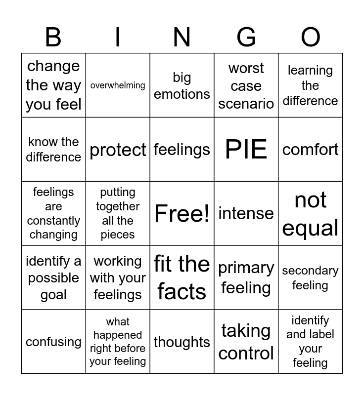 This bingo card has a free space and 25 words: working with your feelings, thoughts, feelings, confusing, learning the difference, change the way you feel, know the difference, overwhelming, intense, fit the facts, PIE, feelings are constantly changing, primary feeling, secondary feeling, protect, information, not equal, big emotions, comfort, putting together all the pieces, identify and label your feeling, what happened right before your feeling, identify a possible goal, worst case scenario and taking control.