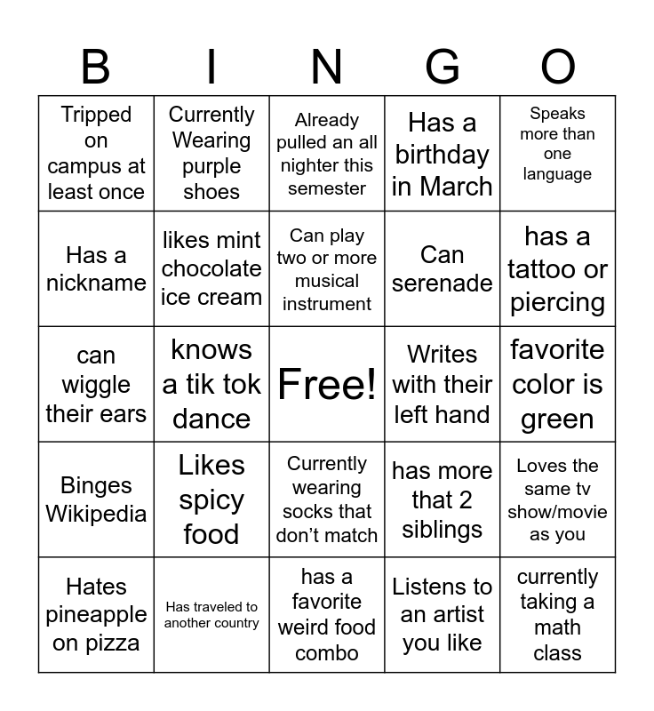This bingo card has a free space and 24 words: Likes spicy food, Has traveled to another country, Can play two or more musical instrument, Hates pineapple on pizza, Speaks more than one language, Tripped on campus at least once, Has a nickname, Currently Wearing purple shoes, Writes with their left hand, Currently wearing socks that don’t match, Can serenade, can wiggle their ears, has more that 2 siblings, Loves the same tv show/movie as you, likes mint chocolate ice cream, Listens to an artist you like, favorite color is green, Already pulled an all nighter this semester, has a tattoo or piercing, knows a tik tok dance, currently taking a math class, Binges Wikipedia, Has a birthday in March and has a favorite weird food combo.