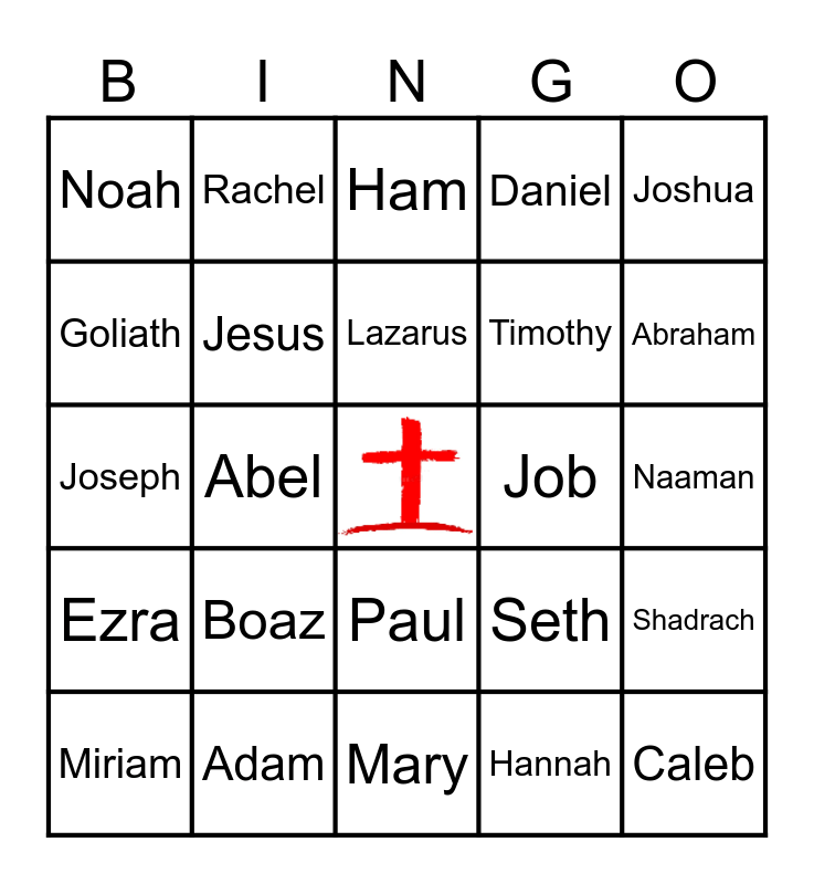 This bingo card has a free space and 30 words: Adam, Eve, Abel, Cain, Noah, Ham, Jesus, Paul, Job, Mary, Naaman, Caleb, Hannah, Jesse, Abraham, Jonah, Seth, Ezra, Boaz, Joshua, Joseph, David, Rachel, Timothy, Goliath, Daniel, Shadrach, Miriam, Lazarus and Lot.