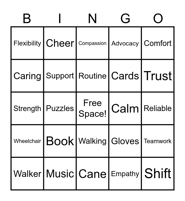 This bingo card has a free space and 29 words: Walker, Lunch, Puzzles, Respect, Flexibility, Compassion, Support, Book, Calm, Music, Reliable, Shift, Cane, Empathy, Trust, Patience, Walking, Wheelchair, Comfort, Strength, Gloves, Water, Cards, Caring, Advocacy, Cheer, Teamwork, Routine and Listening.