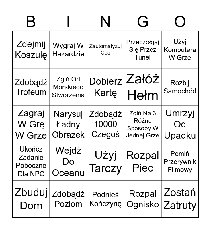 This bingo card has 199 words: Free!, Przejdź Przez Portal, Zabij Się 5 Razy, Zbadaj Całą Mapę, Znajdź Jajko, Wygraj Grę, Przeskocz 10 Kaktusów, Zabij Zombie, Zdobądź Ulepszenie, Załóż Hełm, Zabij Smoka, Złów Rybę, Użyj Jetpack'a, Strzel W Głowę Snajperką, Zjedz 10 Rzeczy, Dokonaj Wymiany, Stań Się Niewidzialny, Dosiądź Zwierze, Zabij Osobę, Ukończ Samouczek, Stwórz Coś, Wyhoduj I Zbierz Plony, Usiądź, Zarób 1 000 000 $, Zdobądź Poziom, Zdobądź Zwierzaka, Strzel Gola, Obsłuż Klienta, Rozpal Piec, Pokonaj Bossa, Podpal Coś, Zbuduj Dom, Rzuć Zaklęcie, Wypij Miksturę, Znajdź Żabę, Znajdź Coś Z Crossover'a, Wykonaj Salto W Tył, Wysadź Bombę, Zbuduj Wieżyczkę, Lataj Statkiem Kosmicznym, Zabij Coś Za Pomocą Otoczenia, Przejedź Kilometr (Musi Być Udowodnione), Wygraj W Battle Royale, Graj Na Instrumencie, Ukradnij Skarb, Zabij Przyjaznego NPC, Zobacz Ducha, Wygraj W Pojedynku 1 Na 1 (Online), Leć Na Księżyc, Użyj Łopaty, Użyj Komputera W Grze, Przeczołgaj Się Przez Tunel, Zagraj W Grę W Grze, Ukończ Zadanie Poboczne Dla NPC, Przeleć Nad Lasem, Rozpal Ognisko, Wyjdź Poza Granice, Wysadź Się W Powietrze, Zabij 10 Takich Samych Rzeczy, Prześpij Całą Noc, Poproś Maszynę, Żeby Coś Dla Ciebie Stworzyła, Zablokuj Się (Tak Żebyś Nie Mógł Wyjść), Wykonaj Wordle, Posadź Drzewo I Obserwuj, Jak Rośnie, Zastrzel Się, Uduś Się, Płyń Łodzią, Stwórz Stworzenie, Nadepnij Na Minę Lądową, Ucieknij Z Celi Więziennej, Wspinaj Się Po Ścianie, Zniewól Stworzenie, Zdobądź Trofeum, Zdobądź Idealny Wynik, Poproś Zwierzaka/Towarzysza O Zabicie Czegoś, Znajdź Dinozaura, Podnieś Kończynę, Przygotuj Posiłek, Ustaw Każdy Suwak Na Maksimum, Wypełnij Swój Ekwipunek, Zdejmij Koszulę, Otwórz Skrzynię Ze Skarbami, Uderz Wroga, Posiadaj Dokładnie Jeden Poziom Zdrowia, Zostań Postrzelony, Dobierz Kartę, Użyj Magii, Umrzyj Z Głodu, Odblokuj Przedmiot Kosmetyczny, Przegraj Wszystko W Hazardzie, Spuść Wodę W Toalecie, Pogłaszcz Psa, Porozmawiaj Z Losową Osobą Na Czacie Głosowym (Musi Odpowiedzieć), Cofnij Się W Czasie, Narysuj Ładny Obrazek, Zrób Okrążenie W Wyścigu, Wejdź Do Oceanu, Rozwiąż Zagadkę, Idź Na Randkę, Rzuć Kostką, Zadaj Obrażenia Krytyczne, Dotrzyj Do Napisów Końcowych Poprzez Rozgrywkę, Spraw Aby Zadanie Się Nie Powiodło, Nadaj Imię Zwierzakowi, Zabij Ostatniego Bossa, Umrzyj Od Upadku, Wspinaj Się Po Drabinie, Sparuj Atak, Zautomatyzuj Coś, Rozwiąż Zagadkę, Dotrzyj Do Punktu Zapisu W Grze (Nie "Zapisz I Wyjdź"), Napij Się Czegoś Z Alkoholem, Wypij Wodę, Zdobądź Pełną Zbroję, Zdobądź Miód, Urośnij/Zwiększ Się, Zostań Oślepiony, Zostań Zatruty, Wejdź Na Pułapkę, Złap Pocisk/Rzucony Przedmiot, Wypełnij Cały Ekwipunek, Pomaluj Lub Zafarbuj Coś, Złam Jedną Z Kończyn, Zawieś Grę, Zgiń Na 3 Różne Sposoby W Jednej Grze, Odzyskaj Zdrowie, Dotknij Trawy, Uderz W Granicę Świata/Niewidzialną Ścianę, Podpal Się, Znajdź Easter Egg, Znajdź Błąd, Osiągnij Serię Zabójstw, Wydaj Wszystkie Swoje Pieniądze, Otwórz Drzwi, Walcz Z Ptakiem, Podnieś Stworzenie (Trzymaj Je W Dłoni, Nie Może To Być Coś Takiego Jak Pokeball), Rozbij Samochód, Stań Na Dachu, Użyj Jojo, Zabij Wroga Po Czym Teabag'uj Go, Zdobądź Dodatkowe Życie, Skorzystaj Z Szybkiej Podróży, Wykonaj Połączenie Telefoniczne, Pomiń Przerywnik Filmowy, Nie Pomijaj Przerywnika Filmowego, Usiądź Na Ławce, Zetnij Drzewo, Poraź Się Prądem, Zaemotkuj, Zobacz Odbicie Swojej Postaci W Lustrze (Po Za Przerywnikami Filmowymi), Zabij Bossa, Zdobądź Coś Oznaczonego Jako Rzadkie, Zdobądź Przedmiot O Nazwie Zaczynającej Się Na Literę Q, Zabij Hydrę, Odwiedź Kosmos, Dowódź Armią, Wykonaj Transformację, Znajdź Coś Za Wodospadem, Zbij Szkło, Zmień Przepływ Ruchu Ulicznego, Wyłowić Coś, Co Nie Jest Rybą, Ukończ Skillcheck'a (Np Gen W Dbd), Zragdoluj Się, Ukończ Codzienne Wyzwanie, Stań Na Taśmie Produkcyjnej, Spraw Aby Coś Umarło Ze Starości, Przeciąż Się, Ukończ Run Roguelike, Zostań Jumpscare'owany, Skocz Podwójnie, Zniszcz Przedmiot (Który Możesz Podnieść), Wskocz Na Ruchomy Obiekt, Przeczytaj Książkę, Zbuduj Most, Schowaj Się W Szafie, Zajrzyj Do Kosza Na Śmieci, Wykop Dziurę, Weź Ślub, Zabij Wroga Z Ukrycia, Przejdź Do Innego Wymiaru, Zobacz/Usłysz Burzę, Przejdź Przez Całą Mapę, Popełnij Przestępstwo, Zdobądź 10000 Czegoś, Flirtuj Z NPC, Użyj Tarczy, Kup Wszystko W Sklepie, Zdobądź Unikalny Przedmiot (Nie Ma Takiego Drugiego W Grze), Złap Stworzenie, Znajdź Ukryty Obszar, Zgiń Od Morskiego Stworzenia, Wygraj W Hazardzie, Znajdź Boga, Zobacz Krew W Grze, Spraw, Aby Gra Uniemożliwiła Ci Zrobienie Czegoś, Zabij 10 Osób, Zanim Zauważą, Zbuduj Barykadę, Oczyść Loch and Zostań Przeklęty.
