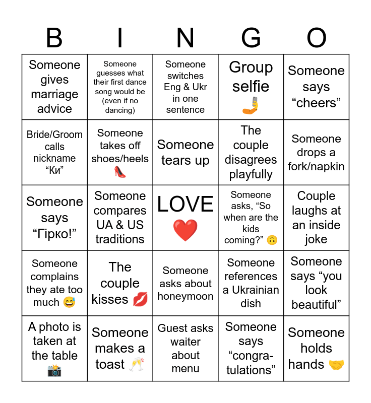This bingo card has a free space and 24 words: The couple kisses 💋, Someone makes a toast 🥂, Someone tears up, A photo is taken at the table 📸, Someone says “cheers”, Someone gives marriage advice, Bride/Groom calls nickname “Ки”, Someone guesses what their first dance song would be (even if no dancing), Someone asks, “So when are the kids coming?” 🙃, Someone asks about honeymoon, The couple disagrees playfully, Someone says “Гірко!”, Someone references a Ukrainian dish, Someone says “you look beautiful”, Someone takes off shoes/heels 👠, Someone says “congra-tulations”, Couple laughs at an inside joke, Someone switches Eng & Ukr in one sentence, Someone drops a fork/napkin, Someone compares UA & US traditions, Someone holds hands 🤝, Someone complains they ate too much 😅, Group selfie 🤳 and Guest asks waiter about menu.