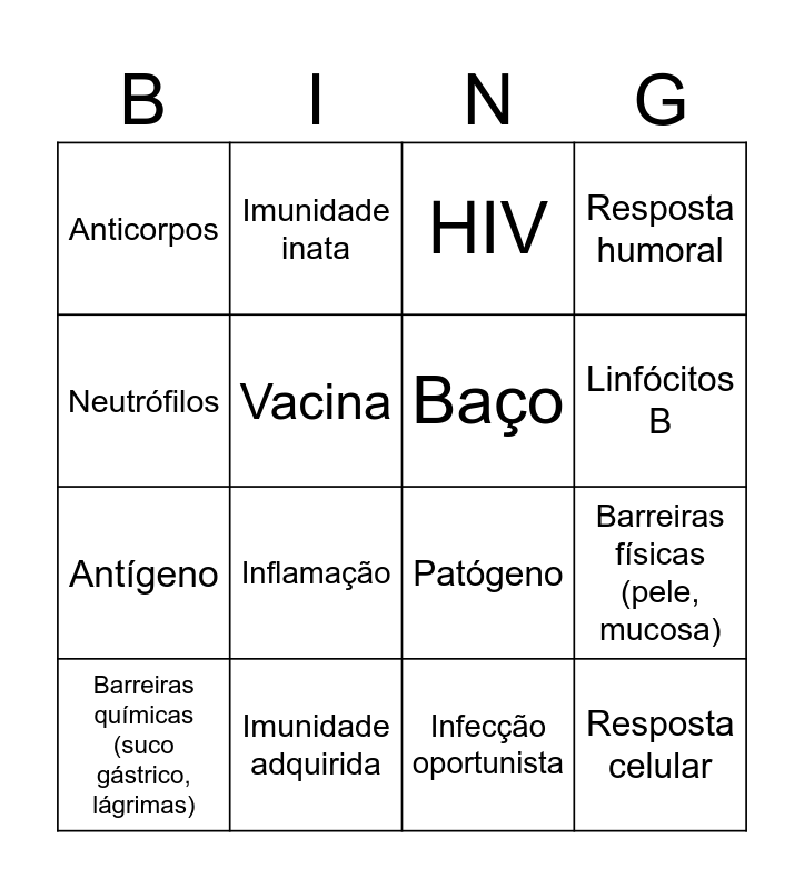 This bingo card has 25 words: Linfócitos T CD4+, Linfócitos T CD8+, Linfócitos B, Macrófagos, Neutrófilos, Anticorpos, Vacina, Imunidade inata, Imunidade adquirida, Citocinas, Antígeno, Patógeno, Memória imunológica, Sistema linfático, Baço, Timo, Infecção oportunista, HIV, Inflamação, Barreiras físicas (pele, mucosa), Barreiras químicas (suco gástrico, lágrimas), Histamina, Resposta celular, Resposta humoral and Fagocitose.