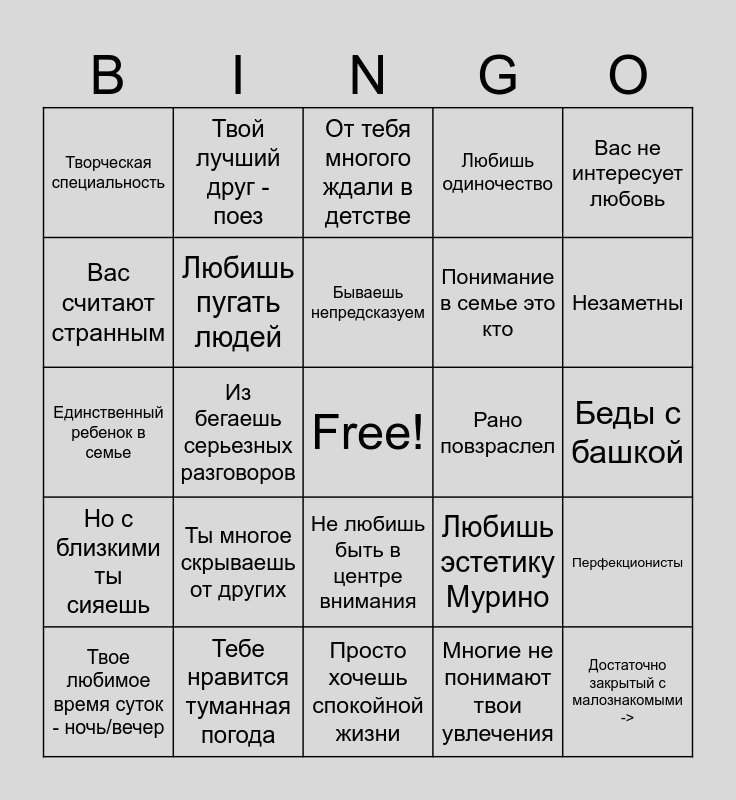 This bingo card has a free space and 24 words: Ты многое скрываешь от других, Тебе нравится туманная погода, Бываешь непредсказуем, Твое любимое время суток - ночь/вечер, Вас не интересует любовь, Творческая специальность, Вас считают странным, Твой лучший друг - поез, Рано повзраслел, Не любишь быть в центре внимания, Понимание в семье это кто, Единственный ребенок в семье, Любишь эстетику Мурино, Перфекционисты, Любишь пугать людей, Многие не понимают твои увлечения, Беды с башкой, От тебя многого ждали в детстве, Незаметны, Из бегаешь серьезных разговоров, Достаточно закрытый с малознакомыми ->, Но с близкими ты сияешь, Любишь одиночество and Просто хочешь спокойной жизни.