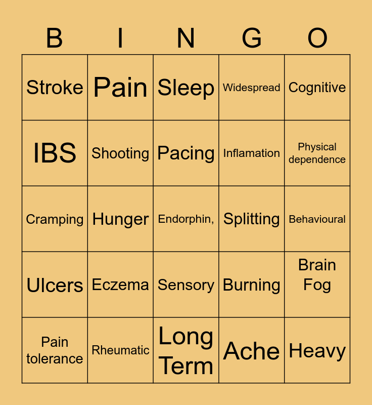 This bingo card has 67 words: Fibromyalgia, Migraine, Stomach cramps, Brain Fog, Insomnia, The 4 Ps, Pain, Purpose, Pacing, Positivity, Sensory, Physical, Behavioural, Cognitive, Spiritual, IBS, Hunger, Stroke, Abscesses, Inflamation, Eczema, Ulcers, Widespread, Ache, Weather affected pain, Stiffness, Fatigue, Transduction, Physical dependence, Tolerance, Endorphin,, Chronic pain, Addiction, Acute pain, Pain threshold, Pain tolerance, Aching, Burning, Cramping, Heavy, Sharp, Shooting, Splitting, Stabbing, Stinging, Women, Men, Rheumatic, Arthritis, Control, Sleep, Emotion, Traumatic, Persistent, Intermittent, Long Term, GP, Unseen, Unheard, Unsupported, Advocacy, September, Validation, Understanding, Awareness, Support and Difficult.
