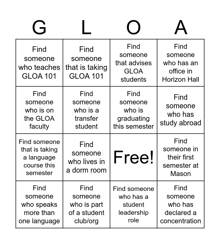 This bingo card has 16 words: Find someone who is part of a student club/org, Find someone in their first semester at Mason, Find someone that advises GLOA students, Find someone who teaches GLOA 101, Find someone that is taking a language course this semester, Find someone that is taking GLOA 101, Free!, Find someone who has a student leadership role, Find someone who is on the GLOA faculty, Find someone who is a transfer student, Find someone who speaks more than one language, Find someone who has an office in Horizon Hall, Find someone who lives in a dorm room, Find someone who has study abroad, Find someone who is graduating this semester and Find someone who has declared a concentration.