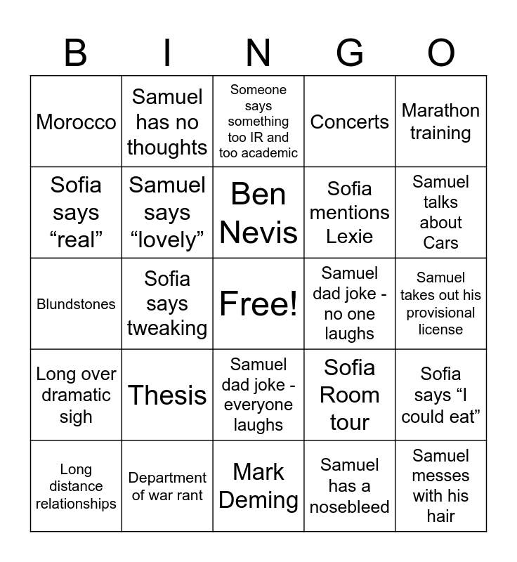 This bingo card has a free space and 25 words: Thesis, Mark Deming, Ben Nevis, Long distance relationships, Marathon training, Morocco, Sofia says “real”, Samuel has no thoughts, Samuel dad joke - no one laughs, Samuel dad joke - everyone laughs, Sofia mentions Lexie, Blundstones, Sofia Room tour, Sofia says “I could eat”, Samuel says “lovely”, Either of them say something British, Samuel takes out his provisional license, Someone says something too IR and too academic, Samuel talks about Cars, Sofia says tweaking, Samuel messes with his hair, Department of war rant, Long over dramatic sigh, Concerts and Samuel has a nosebleed.