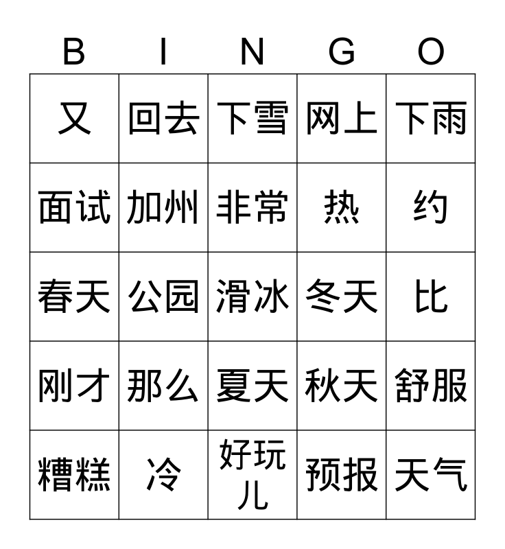 This bingo card has 25 words: 那么, 好玩儿, 非常, 糟糕, 下雨, 又, 面试, 回去, 冬天, 夏天, 热, 春天, 秋天, 舒服, 加州, 天气, 比, 下雪, 约, 公园, 滑冰, 冷, 刚才, 网上 and 预报.