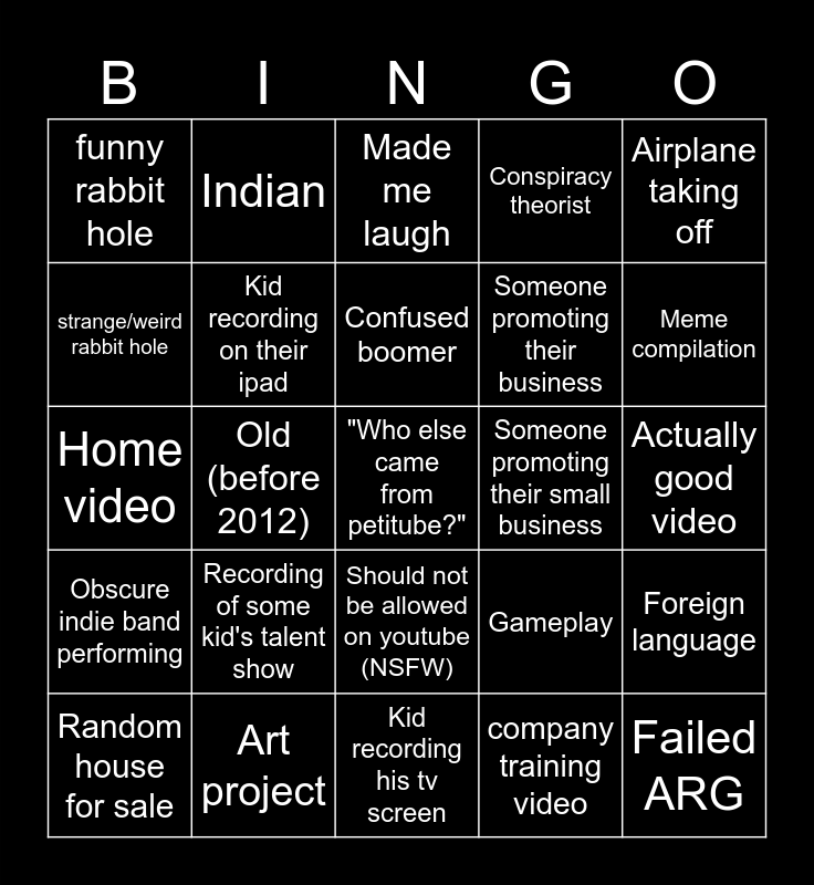 This bingo card has 25 words: Recording of some kid's talent show, Kid recording his tv screen, Confused boomer, Random house for sale, Airplane taking off, funny rabbit hole, strange/weird rabbit hole, Indian, Someone promoting their small business, Should not be allowed on youtube (NSFW), Someone promoting their business, Home video, Gameplay, Foreign language, Kid recording on their ipad, Failed ARG, Actually good video, Made me laugh, Meme compilation, Old (before 2012), "Who else came from petitube?", Art project, Obscure indie band performing, Conspiracy theorist and company training video.