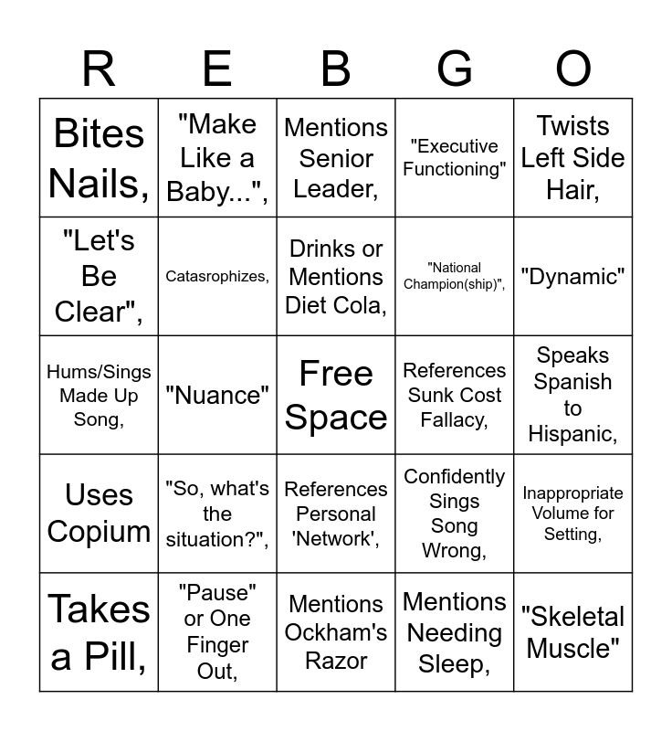 This bingo card has a free space and 24 words: "So, what's the situation?",, "Pause" or One Finger Out,, Drinks or Mentions Diet Cola,, Takes a Pill,, Twists Left Side Hair,, Bites Nails,, "Let's Be Clear",, "Make Like a Baby...",, References Sunk Cost Fallacy,, References Personal 'Network',, "National Champion(ship)",, Hums/Sings Made Up Song,, Confidently Sings Song Wrong,, Inappropriate Volume for Setting,, Catasrophizes,, Mentions Needing Sleep,, Speaks Spanish to Hispanic,, Mentions Senior Leader,, "Dynamic", "Nuance", "Skeletal Muscle", Uses Copium, "Executive Functioning" and Mentions Ockham's Razor.