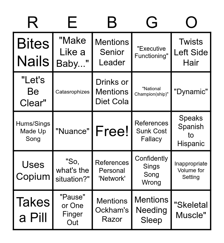 This bingo card has a free space and 24 words: "So, what's the situation?", "Pause" or One Finger Out, Drinks or Mentions Diet Cola, Takes a Pill, Twists Left Side Hair, Bites Nails, "Let's Be Clear", "Make Like a Baby...", References Sunk Cost Fallacy, References Personal 'Network', "National Champion(ship)", Hums/Sings Made Up Song, Confidently Sings Song Wrong, Inappropriate Volume for Setting, Catasrophizes, Mentions Needing Sleep, Speaks Spanish to Hispanic, Mentions Senior Leader, "Dynamic", "Nuance", "Skeletal Muscle", Uses Copium, "Executive Functioning" and Mentions Ockham's Razor.