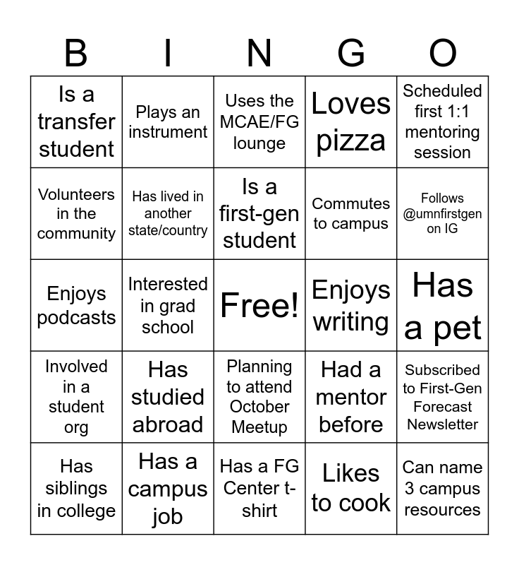 This bingo card has a free space and 24 words: Has studied abroad, Has a campus job, Is a first-gen student, Has siblings in college, Scheduled first 1:1 mentoring session, Is a transfer student, Volunteers in the community, Plays an instrument, Enjoys writing, Planning to attend October Meetup, Commutes to campus, Enjoys podcasts, Had a mentor before, Subscribed to First-Gen Forecast Newsletter, Has lived in another state/country, Likes to cook, Has a pet, Uses the MCAE/FG lounge, Follows @umnfirstgen on IG, Interested in grad school, Can name 3 campus resources, Involved in a student org, Loves pizza and Has a FG Center t-shirt.