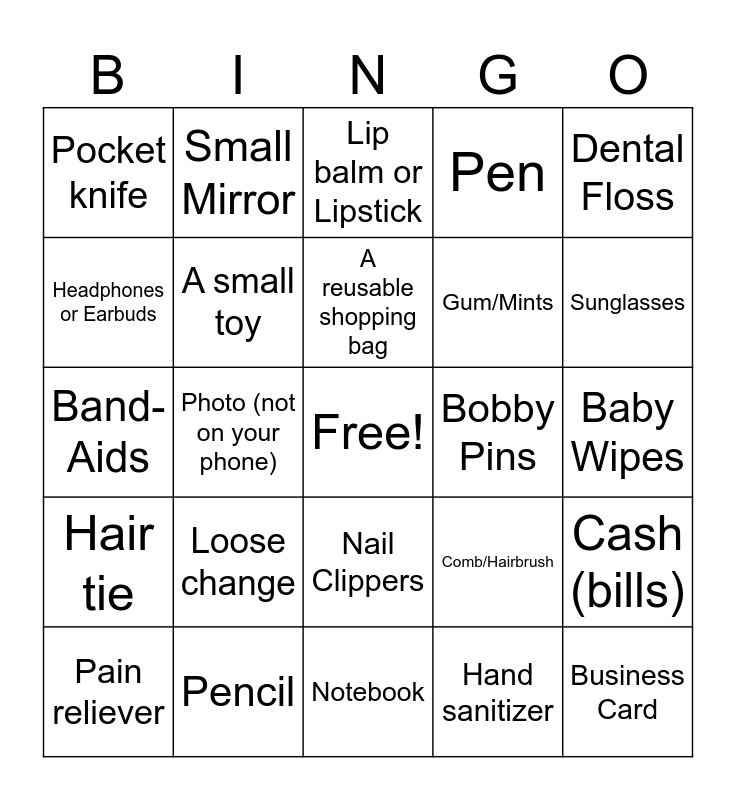 This bingo card has a free space and 28 words: Cash (bills), Keys, Gum/Mints, Hand sanitizer, Headphones or Earbuds, Lip balm or Lipstick, Small Mirror, Hair tie, Bobby Pins, Pain reliever, Band-Aids, Pen, Pencil, Notebook, Sunglasses, A receipt, Loose change, A small toy, A reusable shopping bag, Nail Clippers, Pocket knife, Makeup, Business Card, Photo (not on your phone), Baby Wipes, Comb/Hairbrush, Dental Floss and Library Card.