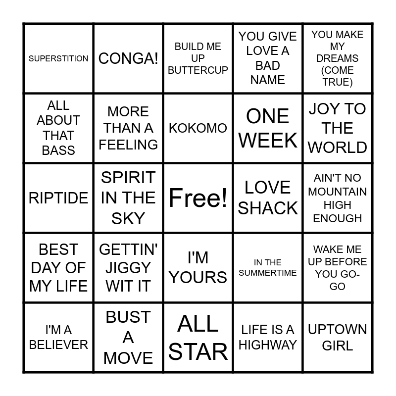 This bingo card has a free space and 55 words: SEND ME ON MY WAY, I'M A BELIEVER, THREE LITTLE BIRDS, SUPERSTITION, ALL STAR, WE BUILT THIS CITY, MORE THAN A FEELING, CARRY ON WAYWARD SON, ONE WEEK, FAT BOTTOMED GIRLS, YOU GIVE LOVE A BAD NAME, OLD TIME ROCK & ROLL, MR. BLUE SKY, NO RAIN, BROWN EYED GIRL, ALRIGHT, YOU MAKE MY DREAMS (COME TRUE), SPIRIT IN THE SKY, ESCAPE (THE PINA COLADA SONG), UPTOWN GIRL, LOVE SHACK, WALKING ON SUNSHINE, IN THE SUMMERTIME, BUILD ME UP BUTTERCUP, I GOT YOU (I FEEL GOOD), KOKOMO, LIFE IS A HIGHWAY, SUGAR SUGAR, AIN'T NO MOUNTAIN HIGH ENOUGH, WAKE ME UP BEFORE YOU GO-GO, SHAKE IT OFF, MR. BRIGHTSIDE, CELEBRATION, HEY, SOUL SISTER, ALL ABOUT THAT BASS, RIPTIDE, ACCIDENTALLY IN LOVE, BEST DAY OF MY LIFE, YOU CAN'T HURRY LOVE, I WILL WAIT, CONGA!, GIRLS JUST WANT TO HAVE FUN, FEEL GOOD INC., FOOTLOOSE, GETTIN' JIGGY WIT IT, BUST A MOVE, JUST A FRIEND, TEQUILA, LAND OF 1000 DANCES, JOY TO THE WORLD, WHAT I LIKE ABOUT YOU, COME ON EILEEN, (WHAT A) WONDERFUL WORLD, I'M YOURS and DANCE HALL DAYS.