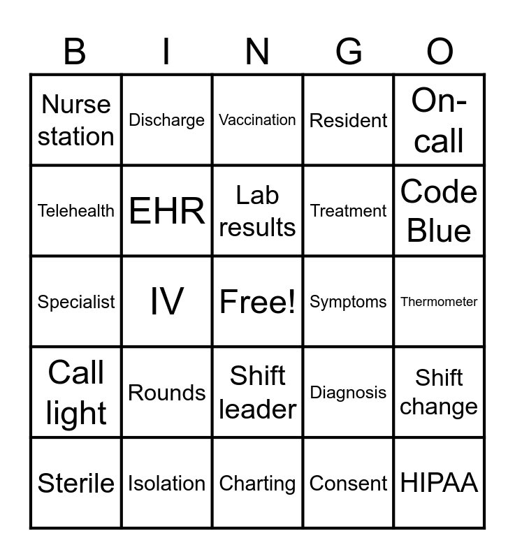 This bingo card has a free space and 52 words: Stethoscope, HIPAA, Vital signs, Charting, Rounds, Scrubs, Discharge, Triage, Telehealth, Blood pressure, EHR, Gloves, Shift change, Diagnosis, Care plan, Patient safety, Lab results, Symptoms, Hand hygiene, On-call, IV, Consent, Nurse station, Treatment, Medication, PPE, Referral, Admission, Code Blue, Pulse, Oxygen, Resident, Shift report, Sanitizer, Bedside, Vaccination, Isolation, Allergies, Critical care, Pharmacy, Blood test, Thermometer, Call light, Restraints, Shift leader, Anesthesia, Infection, Specialist, Exam room, Follow-up, Sterile and Rounds board.