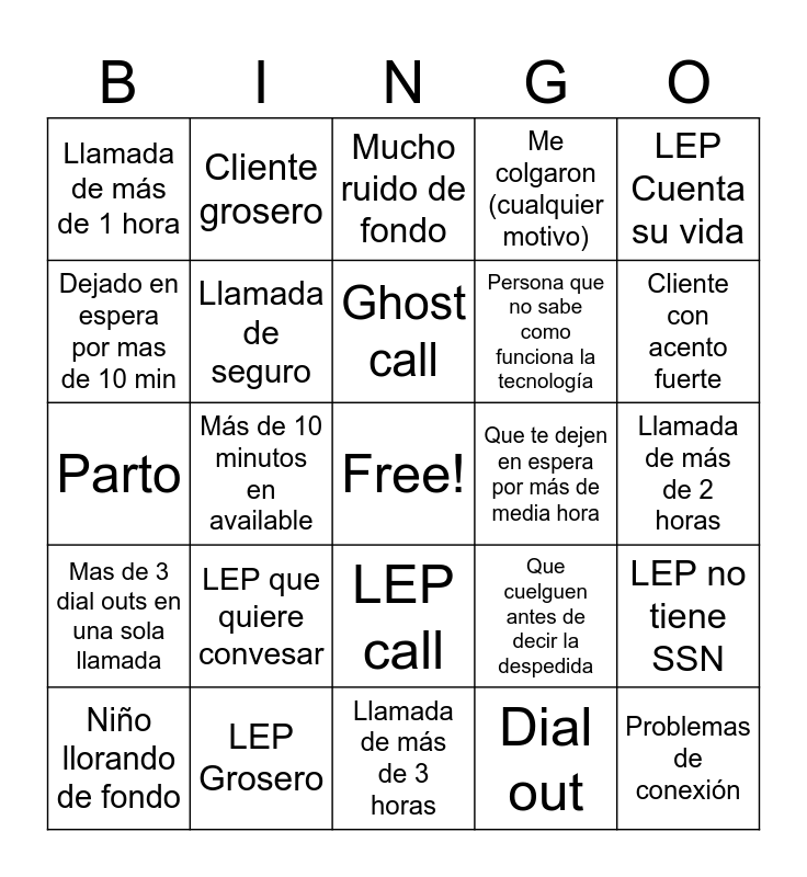 This bingo card has a free space and 24 words: LEP que quiere convesar, LEP Grosero, Ghost call, Niño llorando de fondo, LEP Cuenta su vida, Llamada de más de 1 hora, Dejado en espera por mas de 10 min, Cliente grosero, Que te dejen en espera por más de media hora, LEP call, Persona que no sabe como funciona la tecnología, Parto, Que cuelguen antes de decir la despedida, LEP no tiene SSN, Llamada de seguro, Dial out, Llamada de más de 2 horas, Mucho ruido de fondo, Cliente con acento fuerte, Más de 10 minutos en available, Problemas de conexión, Mas de 3 dial outs en una sola llamada, Me colgaron (cualquier motivo) and Llamada de más de 3 horas.