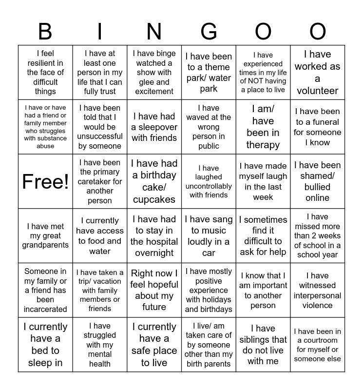This bingo card has 36 words: I have mostly positive experience with holidays and birthdays, Right now I feel hopeful about my future, I live/ am taken care of by someone other than my birth parents, I have or have had a friend or family member who struggles with substance abuse, I have met my great grandparents, I have laughed uncontrollably with friends, I have been told that I would be unsuccessful by someone, I currently have a safe place to live, I have experienced times in my life of NOT having a place to live, I know that I am important to another person, I have been to a funeral for someone I know, I have been to a theme park/ water park, I have witnessed interpersonal violence, I have been the primary caretaker for another person, I have waved at the wrong person in public, I feel resilient in the face of difficult things, Someone in my family or a friend has been incarcerated, I have made myself laugh in the last week, Free!, I have binge watched a show with glee and excitement, I have had a birthday cake/ cupcakes, I currently have access to food and water, I have sang to music loudly in a car, I have had to stay in the hospital overnight, I sometimes find it difficult to ask for help, I have at least one person in my life that I can fully trust, I am/ have been in therapy, I have struggled with my mental health, I have had a sleepover with friends, I have worked as a volunteer, I have been in a courtroom for myself or someone else, I currently have a bed to sleep in, I have missed more than 2 weeks of school in a school year, I have been shamed/ bullied online, I have taken a trip/ vacation with family members or friends and I have siblings that do not live with me.