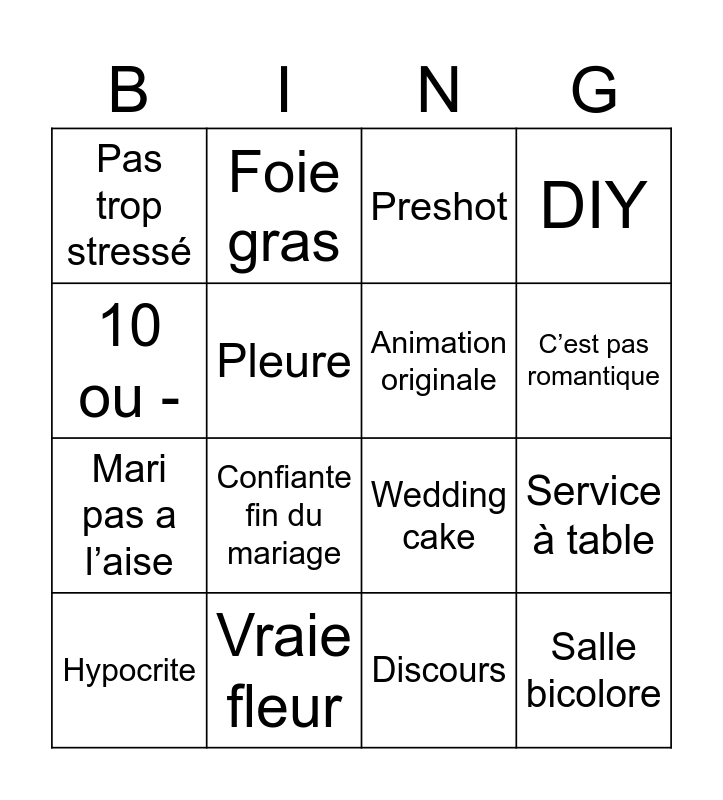This bingo card has 16 words: Vraie fleur, Service à table, Preshot, Pas trop stressé, Mari pas a l’aise, Foie gras, Wedding cake, Discours, 10 ou -, Pleure, Hypocrite, DIY, Confiante fin du mariage, C’est pas romantique, Animation originale and Salle bicolore.