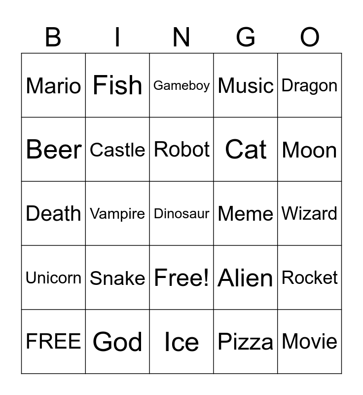 This bingo card has 26 words: Free!, Pizza, Robot, God, Dragon, Mario, Beer, Fish, Wizard, Alien, Cat, Death, Rocket, FREE, Vampire, Monkey, Music, Unicorn, Gameboy, Dinosaur, Moon, Ice, Meme, Snake, Castle and Movie.