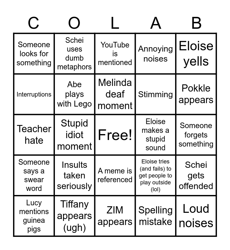 This bingo card has a free space and 34 words: Someone gets mad, Spelling mistake, Melinda doesn't say she's getting lunch (even though she is), Ben the Tech Guy is called, Someone says a swear word, Abe plays with Lego, Eloise yells, Lucy mentions guinea pigs, Schei uses dumb metaphors, Schei fails to get us back on track, Melinda deaf moment, YouTube is mentioned, Someone misspeaks, "lEts tALk AbOUT FeELINGs!", Eloise makes a stupid sound, Pokkle appears, Tiffany appears (ugh), Teacher hate, Insults taken seriously, Eloise tries (and fails) to get people to play outside (lol), A meme is referenced, Lucy vampire moment, Someone looks for something, Someone forgets something, ZIM appears, Loud noises, Annoying noises, Too much yap, Stimming, Interruptions, Same thing repeated twice, Stupid idiot moment, Schei gets offended and Blocked website.