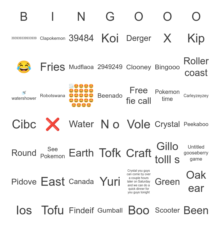 This bingo card has a free space and 48 words: Crystal you guys can come by over a couple hours later on Saturday and we can do a quick dinner for you guys tonight, Bingooo, Gumball, ❌, 🌫🤩🤩🤩🤩🤩🤩🤩🤩🤩🤩🤩🤩🤩🤩🤩🤩🤩🤩🤩🤩🤩🤩🤩, Peekaboo, Clapokemon, Tofu, X, Tofk, Kip, Koi, Pokemon time, Free fie call, Pidove, Crystal, 😂, Roller coast, Green, Derger, Clooney, Water, 393939339933939, Fries, Oak ear, Mudflaoa, Carleyzeyzey, Ios, Beenado, Robotswana, Scooter, Vole, Untitled gooseberry game, East, Cibc, Craft, Gillo tolll s, 🚿 watershower, Earth, Canada, Round, Been, 39484, Findeif, 2949249, Yuri, See Pokemon and Boo.