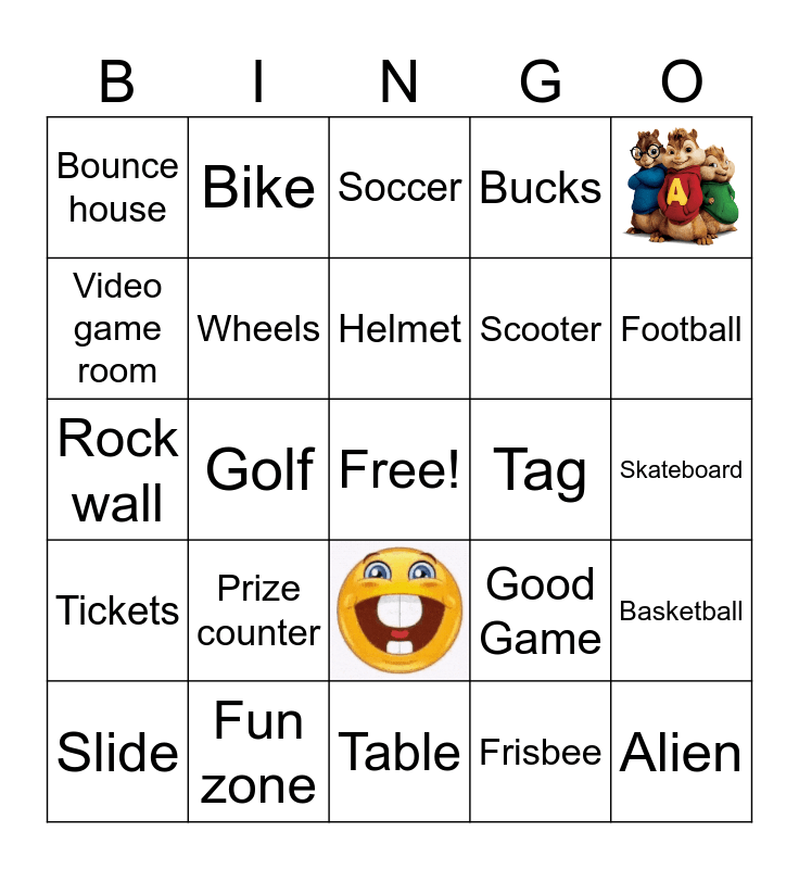 This bingo card has 3 images, a free space and 24 words: Good Game, Clocked in, Scooter, Table, Video game room, Soccer, Bike, Tickets, Tag, Basketball, Rock wall, Bucks, Slide, Fun zone, Football, Classroom, Wheels, Helmet, Prize counter, Bounce house, Skateboard, Frisbee, Golf and Alien.