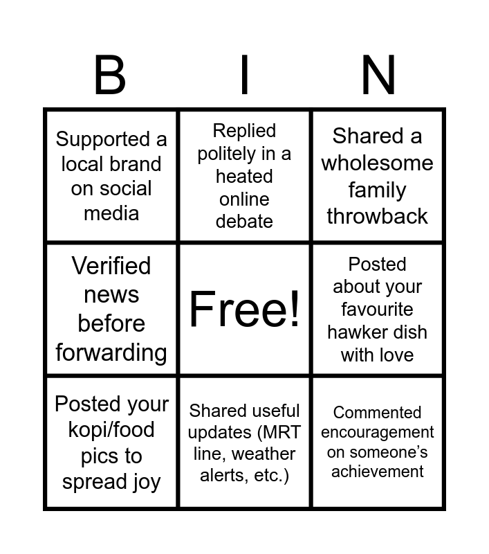 This bingo card has a free space and 14 words: Shared a milestone (graduation, new job, etc.) online, Tagged a friend in a wholesome meme, Posted your kopi/food pics to spread joy, Replied politely in a heated online debate, Verified news before forwarding, Commented encouragement on someone’s achievement, Checked sources before sharing news, Joined a TikTok dance/recipe trend, Shared useful updates (MRT line, weather alerts, etc.), Supported a local brand on social media, Reposted educational content to raise awareness, Posted about your favourite hawker dish with love, Shared a wholesome family throwback and Reposted an official CNA/Straits Times update to inform others.