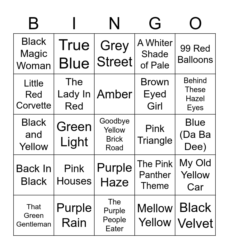 This bingo card has 61 words: Free!, Purple Rain, Tangled up in Blue, Back In Black, Mellow Yellow, Behind Blue Eyes, The Lady In Red, White Wedding, Brown Eyed Girl, Mr. Blue Sky, A Whiter Shade of Pale, Big Yellow Taxi, Little Red Corvette, Fields Of Gold, Red Rain, Black Magic Woman, Goodbye Yellow Brick Road, 99 Red Balloons, Band Of Gold, Amber, Pink Triangle, Grey Street, That Green Gentleman, My Old Yellow Car, Old Yellow Bricks, Pretty Fly (For A White Guy), Orange Crush, Black Hole Sun, Behind These Hazel Eyes, Little Black Dress, Black Horse And The Cherry Tree, Counting Blue Cars, Blue, White Flag, True Blue, Golden, Men In Black, Green Light, Brown Sugar, Black and Yellow, Red Red Wine, Pink Houses, Blue (Da Ba Dee), Green River, The Pink Panther Theme, Orange Colored Sky, Something In Red, Something in the Orange, White Rabbit, Purple Haze, The Purple People Eater, White Horse, Yellow Submarine, Ruby Tuesday, Gold Dust Woman, Gold Digger, Silver Dagger, Pink Cadillac, Pink Pony Club, Black Velvet and Silver Springs.