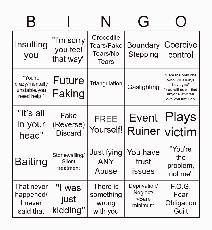 This bingo card has a free space and 24 words: Stonewalling/ Silent treatment, "I was just kidding", Triangulation, That never happened/ I never said that, Coercive control, Insulting you, "You’re crazy/mentally unstable/you need help “, "I'm sorry you feel that way", Event Ruiner, Justifying ANY Abuse, Gaslighting, "It’s all in your head”, You have trust issues, "You're the problem, not me", Future Faking, Deprivation/ Neglect/ <Bare minimum, Plays victim, Crocodile Tears/Fake Tears/No Tears, "I am the only one who will always Love you" “You will never find anyone who will love you like I do”, Fake (Reverse) Discard, F.O.G. Fear Obligation Guilt, Baiting, Boundary Stepping and There is something wrong with you.