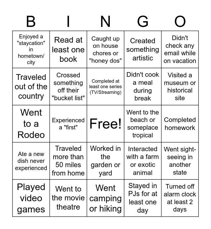 This bingo card has a free space and 24 words: Traveled more than 50 miles from home, Went to the movie theatre, Completed at least one series (TV/Streaming), Played video games, Didn't check any email while on vacation, Enjoyed a "staycation" in hometown/ city, Traveled out of the country, Read at least one book, Went to the beach or someplace tropical, Worked in the garden or yard, Didn't cook a meal during break, Went to a Rodeo, Interacted with a farm or exotic animal, Went sight-seeing in another state, Crossed something off their "bucket list", Stayed in PJs for at least one day, Completed homework, Caught up on house chores or "honey dos", Visited a museum or historical site, Experienced a "first", Turned off alarm clock at least 2 days, Ate a new dish never experienced, Created something artistic and Went camping or hiking.