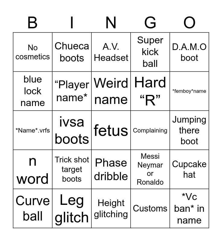 This bingo card has 25 words: n word, Leg glitch, fetus, Customs, D.A.M.O boot, No cosmetics, Chueca boots, A.V. Headset, Complaining, Cupcake hat, blue lock name, “Player name*, Height glitching, Messi Neymar or Ronaldo, *femboy*name, Curve ball, ivsa boots, Weird name, Hard “R”, Jumping there boot, *Name*.vrfs, Trick shot target boots, Phase dribble, Super kick ball and *Vc ban* in name.